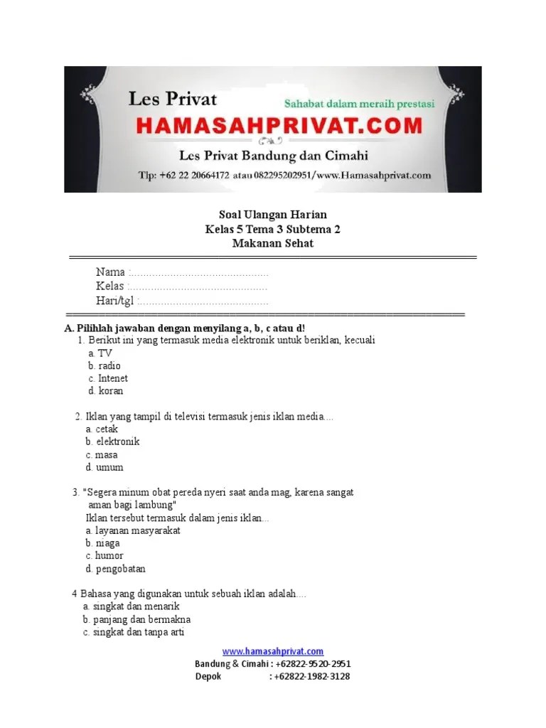 Soal ulangan harian tema 3 subtema 3 kelas 2 sd, soal sbdp kelas .